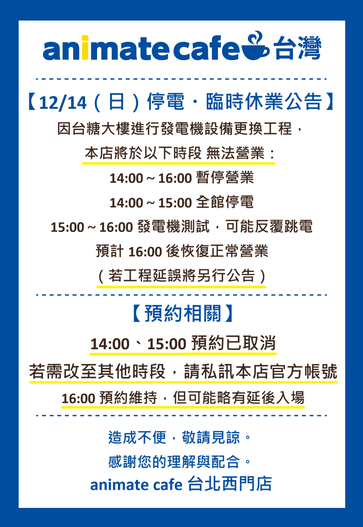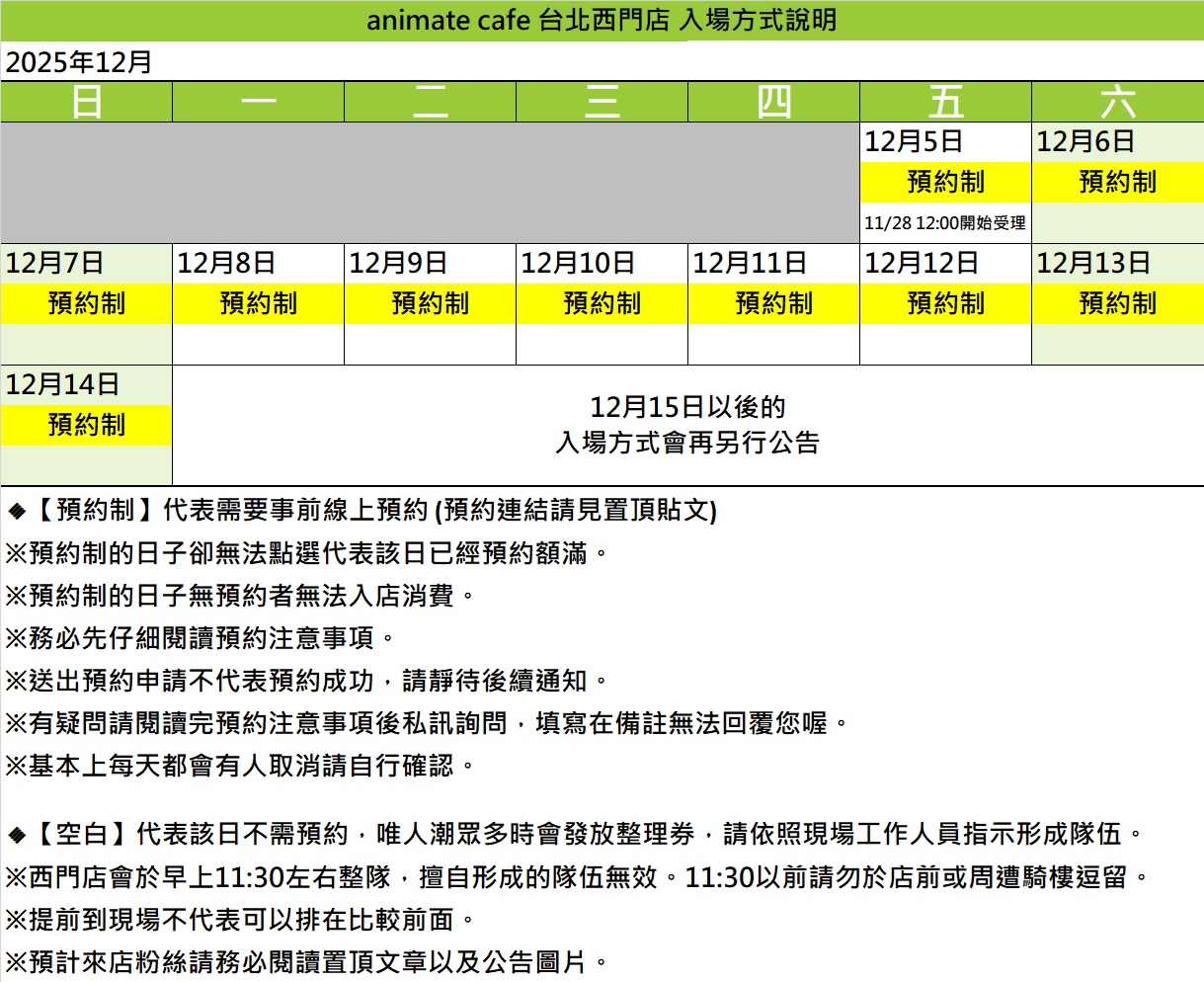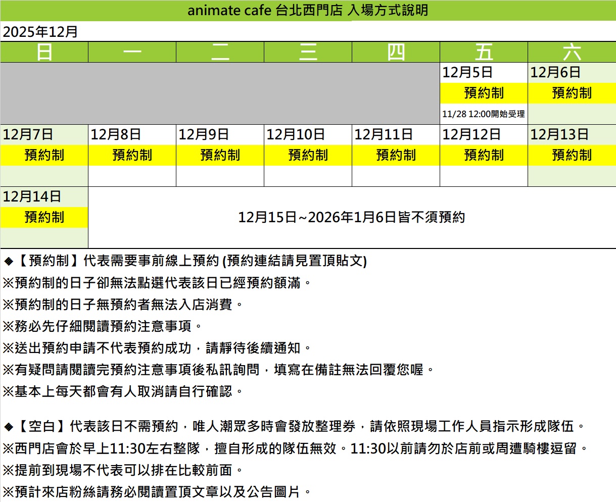 ※如無法準時前來,請務必提前線上取消預約。無取消預約未到者,將列入黑名單日後無法預約。最終取消預約期限為您預約時間的24小時之前,超過此期限將無法取消。(超過期限如按取消,系統會跳出請您電話聯繫店家之提示,此為本預約系統公版設定,台灣 animate cafe 並無提供電話或人工取消之服務敬請注意。)